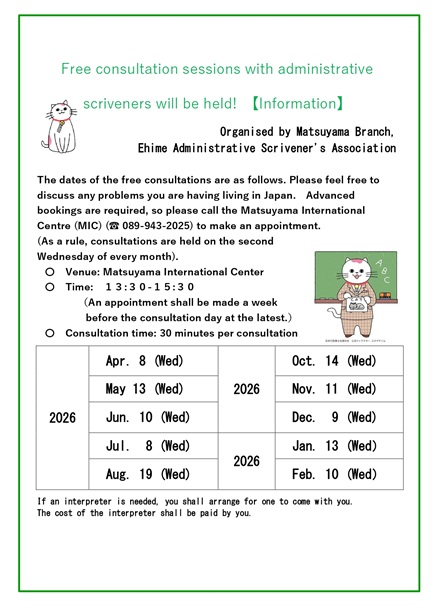 | Certified Administrative Procedures Legal Specialists (Gyoseishoshi) are offering a free monthly consultation service to non-Japanese individuals.