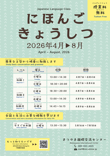 | 問合せ・申し込み先: まつやま国際交流センター(MIC) 〒790-0003 松山市三番町六丁目4-20 コムズ1階 TEL:089-943-2025 FAX:089-931-2041 E-mail: mail@mic.ehime.jp 開館日時:火曜~日曜の午前9時~午後5時30分まで。 ただし月曜が祝祭日の場合は開館し、翌日以降直近の平日に休館します。 |