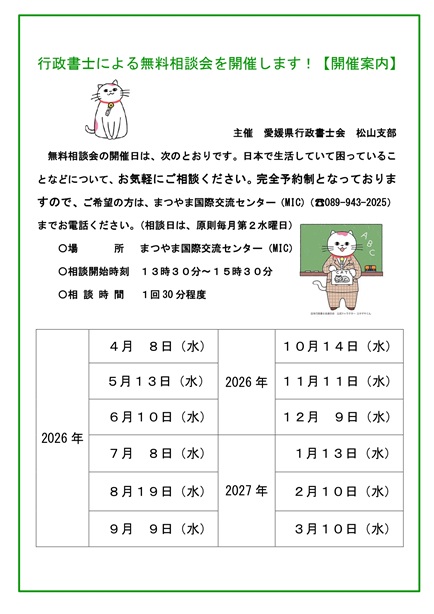 ______________________ ◆日程 : 毎月第2水曜 ◆時間 : 13:30~15:30 ◆場所 : コムズ4階 国際交流会議室 ◆申込方法 : 相談日の前の週の火曜日までに、MICに相談内容と言語をしらせて予約してください。 ______________________