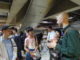 右:語学学校への登校のシーン。地下鉄で関西外語大学に留学したことのある方に声をかけられました。早速、語学研修のアップが始まります。本当は日本語がすごく上手な方でしたが、あえて英語で交流をしていただきました。 |