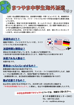 (公財)松山国際交流協会では、中学生を友好都市である韓国の平澤(ピョンテク)市、姉妹都市であるアメリカのサクラメント市とドイツのフライブルク市へ派遣する事業を実施しています。この「まつやま中学生海外派遣」に応募するためには、11月~2月に実施される中学生世界体験プロジェクトに参加する必要があります。